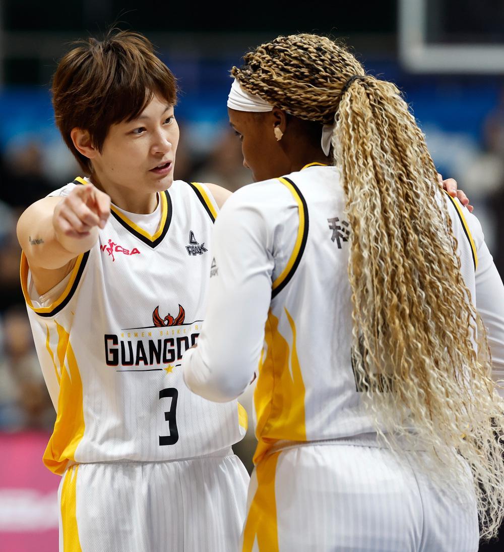 1月20日,广东东莞新彤盛队球员兼助理教练杨力维(左)与队友科利尔在比赛中交流。新华社记者 王丽莉 摄