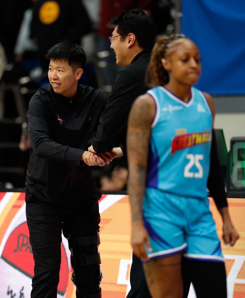 1月20日,广东东莞新彤盛队主教练黄思静(左)在赛后与北京首钢园队主教练李翔致意。新华社记者 王丽莉 摄